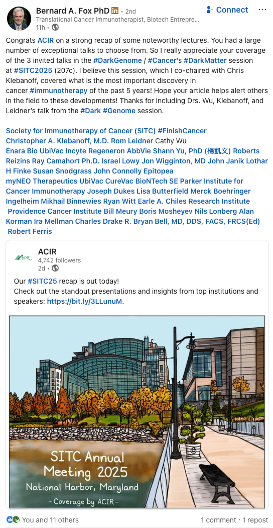 The ACIR weekly newsletter is an invaluable resource for me as a cancer researcher and drug developer. The recent explosion of IO related literature makes it difficult to review everything that is published. The ACIR newsletter makes it accessible to the most important and significant research in IO. This allows me more time to focus on drug development and be confident that I am remaining current with a rapidly advancing field.