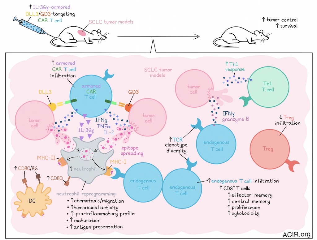 Based on their earlier research, Zuo et al. then assessed whether IL-36γ armoring of the dual-targeting CAR-T could increase the therapeutic efficacy in an immunocompetent mouse model. Given their previously established therapeutic efficacy in SCLC models, IL-18-armored CAR-T were used as controls. In mice bearing liver metastatic SCLC, unarmored CAR-T treatment had no antitumor effects, while both types of armored CAR-T induced tumor regression and improved survival. However, complete tumor eradication was only achieved with the IL-36γ armor.
