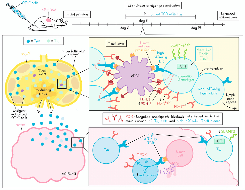 Investigating how high-TCR affinity CD8+ TSL cells retain their stemness, despite continued antigen stimulation and proliferation (typically associated with more terminal differentiation), Hor et al. interrogated the role of PD-1 and found that clustered OT-I TSL cells interacting with cDC1s demonstrated polarization of PD-1 towards the T cell–dendritic cell synaptic interface, and that PD-1 on OT-I cells colocalized with PD-L1 on cDC1 cells. Additionally, while PD-L1 was highly expressed among migratory dendritic cells, even at steady state, PD-L2 showed increased expression on cDC1s in the tdLN on day 8. Co-blockade of anti-PD-L1 and anti-PD-L2 revealed that while OT-I cells showed a burst of proliferation after treatment, expression of TCF1 on OT-I cells near cDC1s was reduced and markers of apoptosis were increased, suggestive of activation-induced cell death in the absence of PD-1 signaling. 8 days after checkpoint blockade (anti-PD-L/anti-PD-L2 or anti-PD-1), the average imputed TCR affinity of remaining TSL cells was substantially lower, high-affinity SLAMF6+ TSL cells were reduced, and high-affinity SLAMF6- TSL cells, along with both high and low-affinity Teff cells, were increased. These results suggest that in the absence of PD-1 signaling, high-affinity T cells either differentiate into effector cells or undergo apoptosis, allowing lower-affinity clones to expand as well. Similar results were observed when checkpoint blockade was given later. Further, checkpoint blockade cessation did not reverse the phenotypic shift towards SLAMF6- TSL cells, nor did it replenish the high-imputed-affinity SLAMF6+ TSL cell pool, suggesting the possibility of lasting or even permanent effects.