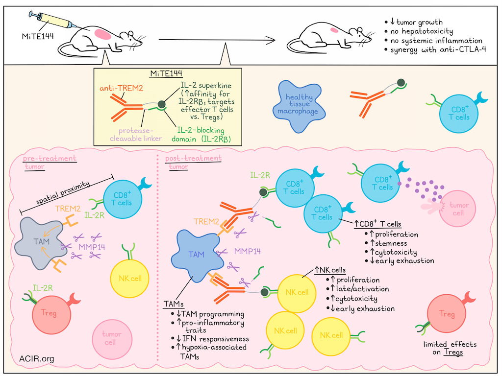 To overcome this systemic toxicity, the researchers developed an inactive IL-2SK domain (pro-cytokine) containing a blocking domain (IL2-Rβ) with a protease-cleavable linker, which could be activated locally by TAM-associated proteases. To determine which protease to use for this construct, scRNAseq analysis of protease expression was performed on immune cells from a human cancer atlas, and PBMCs from healthy donors. TAMs showed higher expression of several proteases, and MMP14 was selected for its high expression in TAMs and limited expression in other immune cells. There was also a strong correlation between MMP14 and TREM2 expression in both human and murine tumors. Based on this, four variants of myeloid-targeted ICKs (MiTEs) were designed, and one of these was selected for further assessment. MiTE144 showed high affinity and specificity for TREM2, did not bind IL-2Rβ in its intact form, induced strong T cell proliferation after protease treatment, and had limited impact on Treg activity.