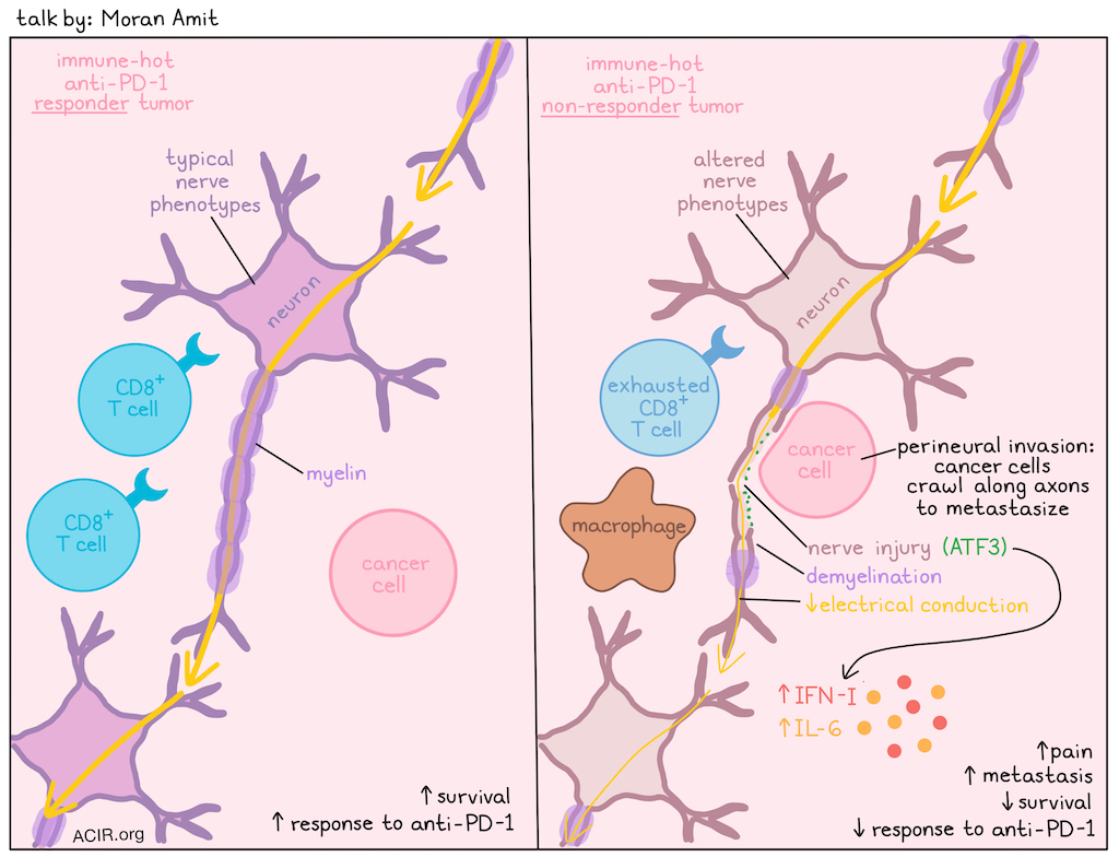 Moran Amit explored the emerging field of cancer neuroscience, focusing on the critical role of nerves in tumor progression and immunotherapy resistance. While the presence of nerves in tumors has been known for more than 120 years, more recent research shows tumors transition neural signal dependence from sympathetic (adrenergic) to parasympathetic (cholinergic), and actively recruit nerves. Tumors possess a unique neural landscape, and the nerves within them change phenotype (e.g., sensory nerves acquiring adrenergic features), affecting clinical outcomes like pain, metastasis, and survival. Furthermore, there is a crosstalk between nerves, tumors, and the immune system. A clinical trial in patients with advanced (non-melanoma) skin cancers treated with anti-PD-1 revealed that non-responders had strong gene signatures for nerve injury and glial cell response to injury in pre-treatment samples. This correlation was unique to "hot", highly immune-infiltrated tumors (no correlation was found in cold tumors), highlighting robust neuro-immune crosstalk. When looking at TCGA data of other anti-PD-1-treated tumors (melanoma and gastric cancer), poor responses to immunotherapy correlated with a strong nerve injury signature. Spatial nanostring genomics revealed signatures of Parkison’s disease, Alzheimer's disease, and ALS in nerves in the tumor microenvironment (TME). Denervation (removal of nerves in the TME) in preclinical models led to better responses to anti-PD-1. In contrast, a procedure called axotomy, in which the nerves were injured, but not removed from the TME, the response to anti-PD-1 was lost. To find out what might have caused nerve injury in the pre-treatment samples of the patients, Amit and his team used scanning electron microscopy and found evidence of perineural invasion, where cancer cells crawl along nerves to metastasize. This is more frequently seen in pancreatic, prostate or salivary gland cancer, and negatively affects prognosis. Cancer cells encasing the axon induce injury by breaking the protective myelin sheath (demyelination), structurally and functionally damaging the nerve, and causing a loss of electrical conduction (signal propagation). In human samples and a perineural invasion model, it was shown that in areas of nerve injury (marked by ATF3 expression, the master regulator of nerve regeneration after injury), the immune microenvironment shifts from functional CD8+ T cells to an accumulation of pro-tumorigenic macrophages and exhausted CD8+ T cells. Non-responders showed elevated type I IFN and IL-6 expression. Immune suppression is a mechanism of anti-PD-1 resistance, and ATF3 drives this resistance by boosting type I IFN. Blocking IFNAR1 restored anti-PD-1 sensitivity and slowed tumor growth in mouse models. Amit finished his talk by summarizing that nerve injury, often caused by perineural invasion, drives an immunosuppressive microenvironment, causing resistance to anti-PD-1. He also pointed out that the nervous system is a highly targetable system, offering new therapeutic avenues by repurposing neurological and psychiatric tools to enhance cancer treatment.