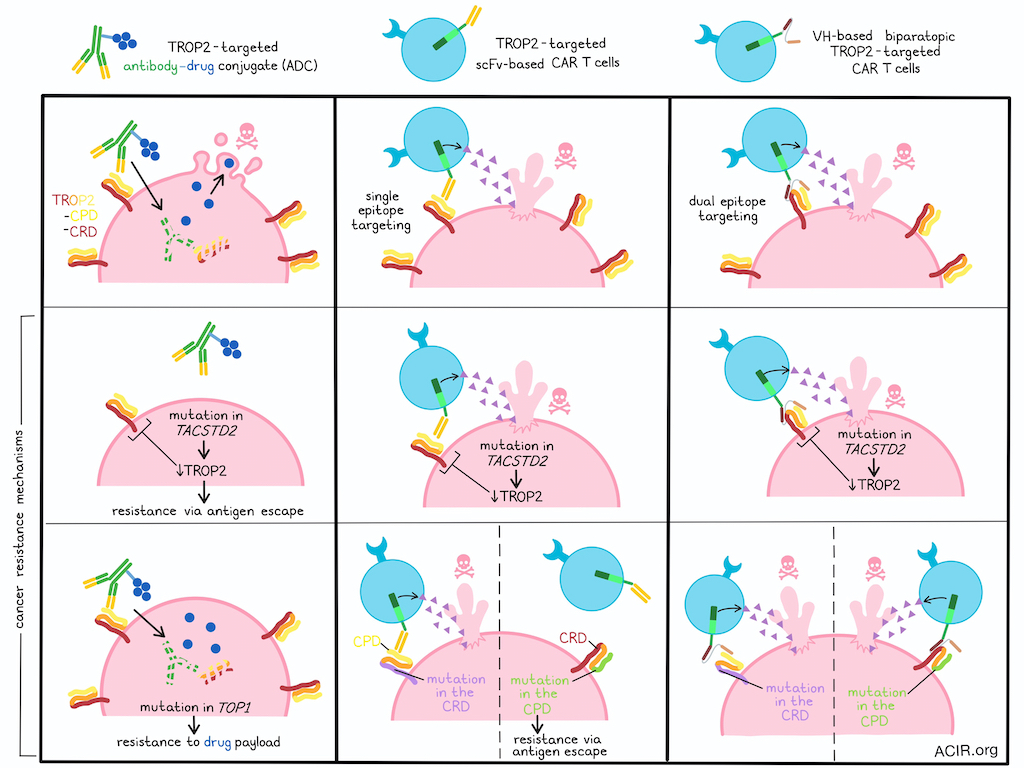 TROP2 is a fetal oncogene that is expressed in a number of cancer types, and while it can be successfully targeted by antibody–drug conjugates (ADCs), cancer cells often develop ADC resistance, either through loss of expression of the targeted TROP2 epitope, or acquired resistance to the drug payload. In an effort to more successfully target TROP2, Brea et al. engineered TROP2-targeted CAR T cells, including biparatopic CAR T cells targeting multiple TROP2 epitopes to minimize antigen escape. Their work was recently published in Cancer Immunology Research.