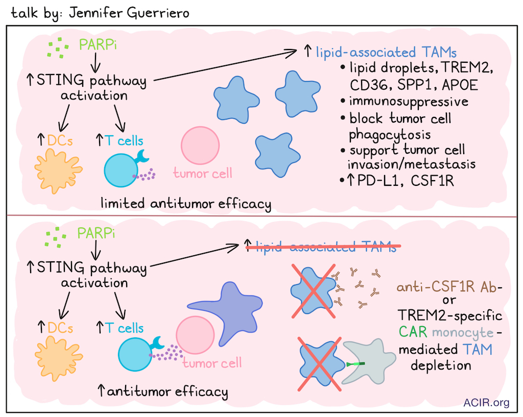 Jennifer Guerriero’s work has focused on characterizing tumor-associated macrophages (TAMs) across breast tumors, where elevated TAM levels are associated with worse outcomes across multiple tumor types. Breast tumors recruit large numbers of monocytes, and support their differentiation into macrophages, which acquire a phenotype that supports cancer cell survival, angiogenesis, and metastasis, and is highly immunosuppressive. Therefore, targeting TAMs is of interest, but, so far, has not yielded major successes. A better understanding of TAM complexity (phenotype, spatial organization, metabolic programming, homeostatic tissue regulation) might reveal more effective therapeutic targets. Therefore, Guerriero and team generated a scRNAseq TAM atlas to characterize the different phenotypes in the breast TME, revealing 10 subtypes. (Guerriero digressed briefly to urge the field to move beyond the uninformative M1/M2 description toward a more exact description of particular subtypes.) GPNMB TAMs (TREM2, APOE, FABP4) and SPP1 TAMs (CD73, MARCO, TREM2) were most frequently found across breast tumors. GPNMB TAMs exhibited a metabolic lipid signature, and SPP1 TAMs exhibited lipid signaling and hypoxia signatures. Lipid-associated TAMs contain lipid droplets and express TREM2, CD36 (lipid uptake receptor), SPP1, and APOE; they are found in normal tissues but are more abundant in tumors, where they are highly immunosuppressive, block tumor cell phagocytosis, and enhance invasion and metastasis. In a murine TNBC model, PARP inhibitor (PARPi) treatment induced suppressive lipogenic PD-L1+CSF-1R+ TAMs. In vitro, PARPi increased macrophage CSF-1R and PD-L1 expression, with transcriptomic differences in lipid metabolism. In work that had followed a separate path demonstrating that PARPi treatment led to upregulation of the STING pathway and strong T cell immunity, multiple clinical trials combining a PARPi and anti-PD-L1 were conducted, but none showed clinical benefit. Guerriero then asked whether this was due to PARPi also inducing immunosuppressive TAMs. This was investigated using samples from patients with advanced BRCA-mutated breast cancer treated with PARPi plus ICB in a clinical trial. PARPi induced STING signaling, increased T cells, DCs, and suppressive TAMs with lipid metabolic signatures. To target these TAMs, anti-CSF-1R therapy was assessed in a murine model. Combining this therapy with PARPi improved survival, which was dependent on CD8+ T cells, as was predicted based on the activities of the individual agents. This led to a phase Ib trial of the approved anti-CSF-R1 drug axatilimab in combination with olaparib (PARPi) in patients with metastatic HER2-negative BRCA-associated breast cancer; this trial is currently enrolling. Looking for other targets, TREM2 was commonly detected on these suppressive, lipogenic TAMs. In preclinical models, TREM2 deletion or inhibition is antitumorigenic, and dual anti-FOLR2 and anti-TREM2 CAR-T can clear TREM2+ TAMs and induce tumor regression. Given the unsatisfactory performance of CAR-T cells targeting solid tumors, for a variety of reasons, such as poor infiltration into the tumor, as an alternative, monocytes were engineered to express an anti-TREM2 CAR. Upon differentiation into macrophages in the tumor, these TREM2-CAR_Mono can phagocytose TREM2+ TAMs. Phagocytosis of target cells was confirmed in vitro. In the in vivo E0771 model, which has many TREM2+ macrophages, treatment with these CAR-monocytes doubled CD8+ T cells after 2 weeks, and reduced tumor burden by 50%. The effects could be further enhanced by combining treatment with anti-PD-1. Current work focuses on bringing this therapy to the clinic and researching improvements to the intracellular domains and cytokine armoring.