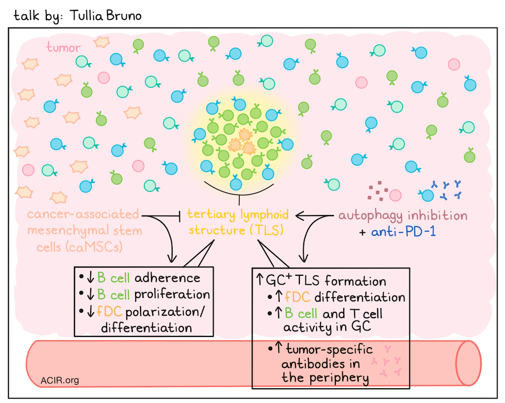 Tullia Bruno’s research focuses on tertiary lymphoid structures (TLSs), their formation and function, and whether they can be targeted. TLSs require multiple cues to form (chemokines, lymphotoxin B, antigen, the right type of stroma, etc.) and are not a uniform state in solid tumors. Rather, they exist along a spectrum with three main states, ranging from lymphoid aggregate, to TLS, to TLS with a germinal center (GC) – a spectrum that has been refined using advanced spatial biology. GC+ TLSs are less common, vary across cancer types, and are rarely present in the treatment-naive setting. As an example, comparing HPV+ and HPV- head and neck squamous cell carcinoma (HNSCC) revealed differences in B cell populations and TLS and GC formation; however, TLS activity, as measured by Ki67 and antibody maturation, and its prognostic value were similar across these cancer types. In patients with ovarian cancer, however, differences were found between tumors in the fallopian tube, omentum, or ovary, with tumoral TLSs in the ovary having reduced GC formation and B cell activity. In brain metastases of lung cancer or melanoma, TLS activity could be very different. Bone marrow-derived or normal mesenchymal stem cells (MSCs) migrate to inflamed areas, and are precursors of follicular DCs (fDCs), while cancer-associated MSCs (caMSCs) are “educated” by the tumor, promote tumor initiation, and are immunosuppressive. Bruno and team developed a caMSC signature whose expression increased with increasing distance from TLSs. In vitro testing of caMSC revealed lower B cell adherence, reduced B cell proliferation, and inhibited fDC polarization. Patients with ovarian cancer expressing both caMSC and TLS signatures had survival outcomes similar to those without the TLS signature, whereas those with only the TLS signature had better outcomes. In pancreatic cancer, fDC differentiation is negatively impacted by the presence of caMSCs. In clinical trial samples, autophagy inhibition plus anti-PD-L1 increased fDC differentiation in TLS, while both monotherapies and the combination increased B and T cell activity within the GC, resulting in higher peripheral levels of tumor-specific antibodies. Therefore, GC could be induced by therapy, depending on the therapeutic and the microenvironment. Intratumoral B cells that are not in a TLS and are in contact with tumor cells become exhausted, with reduced effector function, decreased plasma cell differentiation, and increased expression of inhibitory and homing receptors. The inhibitory receptor FcRL5 inhibited intratumoral B cell activity, and in vitro FcRL5 blockade increased B cell proliferation in the absence of tumor cells. In the presence of HNSCC cells, treatment was only beneficial when those tumors were HPV+ and TLR9 was present. Bruno and team aimed to further develop murine models to study TLS. One model is an orthotopic carcinogen-induced model, which results in non-small cell lung cancer (NSCLC)-like lesions. In this model, TLSs take 10-15 weeks to form, and may decrease in later stages of disease. These TLSs may contain GCs, and tumors with GC+ TLSs have lower tumor burden than those without GCs; TLSs without GCs were prognostically beneficial only when they were active TLSs. Tumors without TLSs had a lower tumor burden, but were characterized by strong oncogenic pathways, suggesting growth potential, whereas tumors with GC+ TLSs exhibited upregulated inflammatory pathways. B cell depletion reduced TLS formation, and those that formed lack GCs, resulting in reduced peripheral antibody levels and a higher tumor burden. Searching for therapeutic targets and biomarkers uncovered CD52 and CD37, which are B cell-specific genes associated with more active TLSs. Low expression of these genes was associated with worse survival in NSCLC. Finally, a phase 2 clinical trial in patients with metastatic melanoma showed that anti-LAG3 helped B cells remain activated, and anti-LAG 3 plus anti-PD-1 increased plasma cells. These data suggest these structures can be therapeutically targeted.