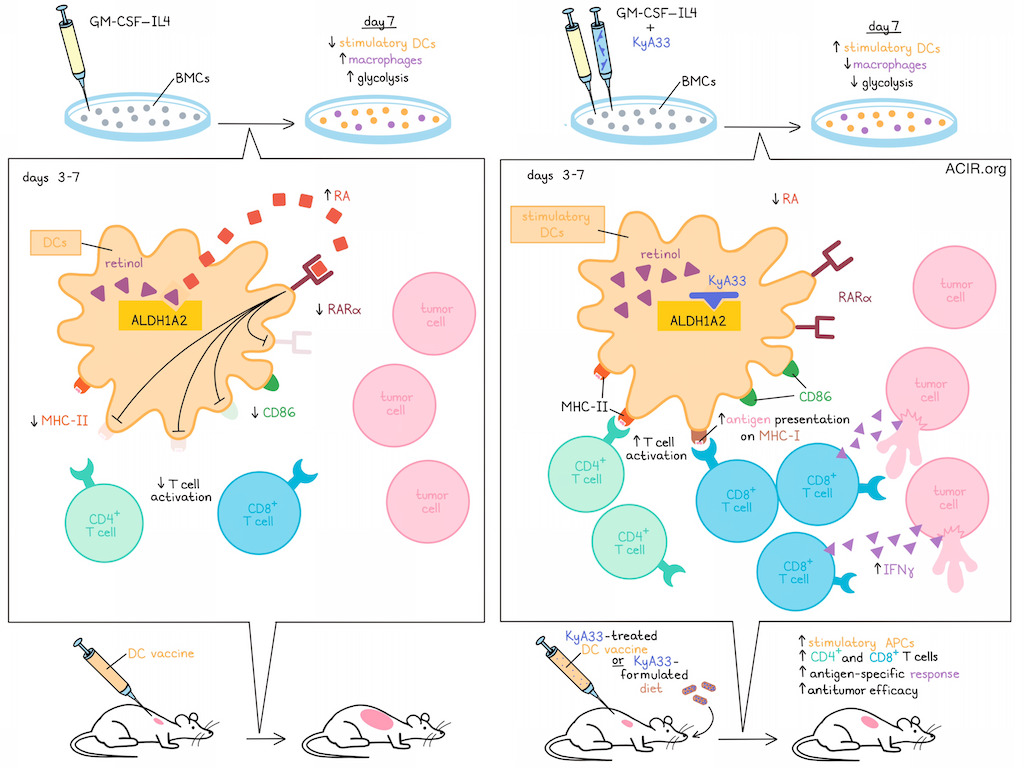 As professional antigen-presenting cells, dendritic cells have been utilized as whole-cell vaccines, but their clinical efficacy has thus far been limited. Fang et al. found that a common protocol of using GM-CSF and IL-4 to induce bone marrow cells (BMCs) into DCs for use in vaccines led to a decline in antigen presentation and functional attenuation of DCs starting at day 3. Investigating this, the group identified autocrine retinoic acid (RA) as an inhibitor of DC function, and developed a drug to disrupt this tolerogenic feedback mechanism.