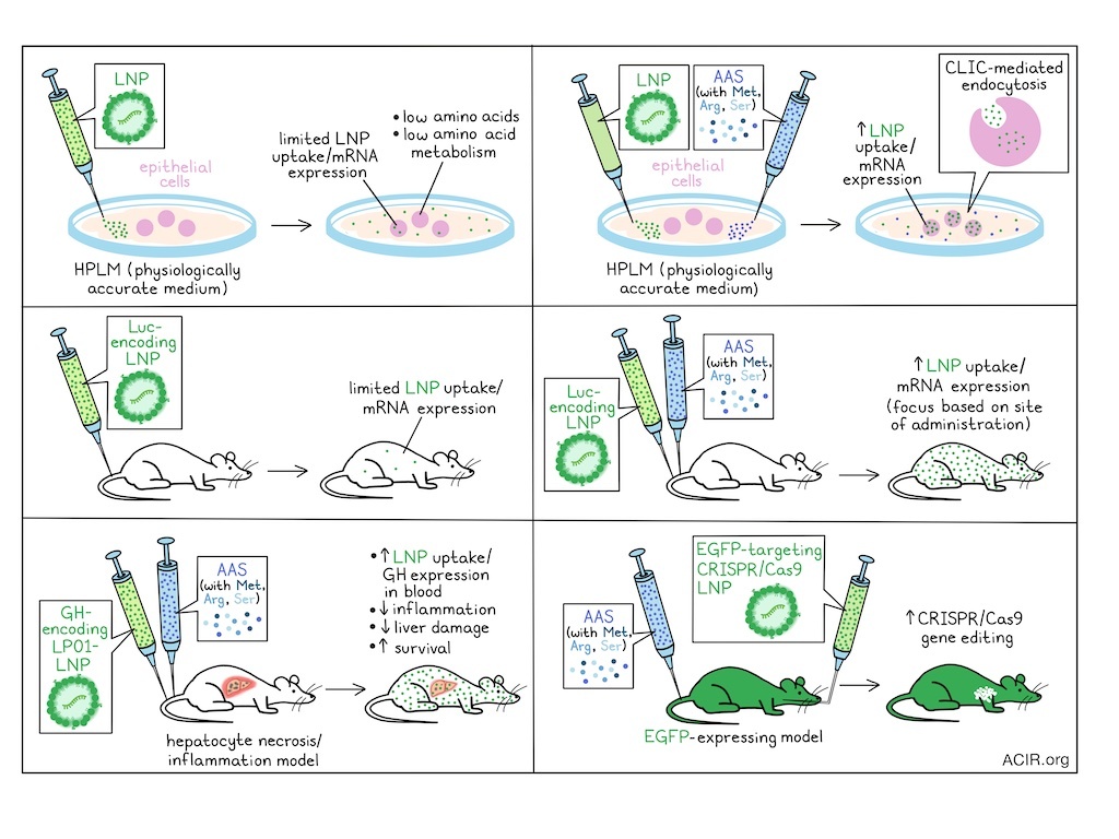 The data in this study demonstrate that in vivo delivery of LNPs can be improved by supplementing with amino acids. These findings, once further optimized for specific applications, could advance the clinical translation of various treatment technologies, including tumor-targeting mRNA vaccines.