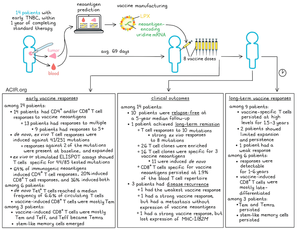 Triple-negative breast cancer (TNBC) is characterized by DNA repair deficiency, genomic instability, and an immunogenic tumor microenvironment, suggesting it might serve as a candidate for individualized vaccination targeting somatic tumor mutation-associated neoantigens. Sahin, Schmidt, et al. recently published the results of a first-in-human clinical study with this strategy in Nature.